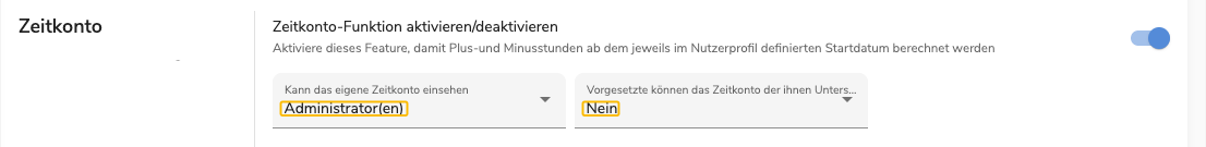 Für Admins: Da das Zeitkonto aktuell teilweise fehlerhafte Werte anzeigt, kannst du den Reiter für Nutzer deaktivieren, um Missverständnisse zu vermeiden.